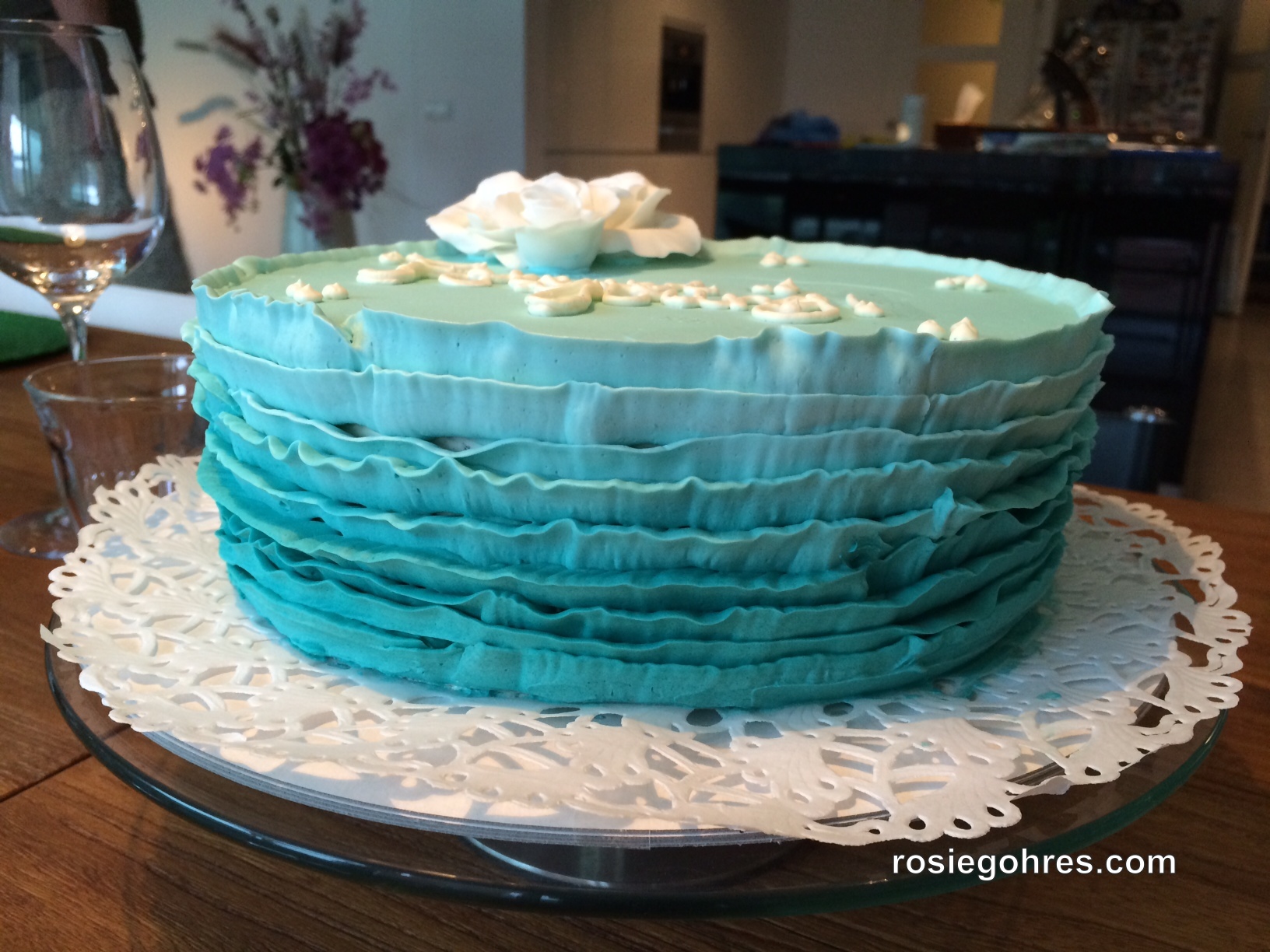 I stumbled upon Zoe while I was googling for an American cake. I wanted something different, something unique with swiss buttercream and made to order with ruffle looks. I must say I was very happy when I contacted Zoe and she knew what I wanted. She asked me what flavour, colour, text ,size of cake , toppings etc . Easy to order and great communication and there I have it, my beautiful decorated ruffle cake and yummy too! And weeks later, I ordered a second cake from her again! Best is to email Zoe as she has her hands full 🙂 Place your order in advance! Photo is chocolate cake with cherries and coconut swiss buttercream filling with turquoise ruffle looks.